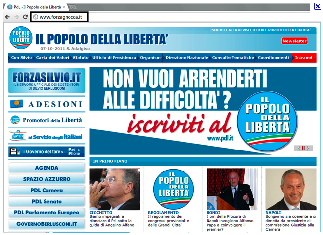Il partito “Forza Gnocca” una battuta? Sicuramente, eppure digitando su Internet www.forzagnocca.it fino alle 11 di stamattina si veniva reindirizzati al sito del Pdl. Insomma, qualcuno ha preso sul serio il premier. Cambia il contenitore ma non il contenuto: con l’immagine del segretario Angelino Alfano che promette: “Avremo congressi liberi e aperti”. E un riquadro che suggerisce di iscriversi al Pdl se “non vuoi arrenderti alle difficoltà”. Già, le difficoltà. Per uscirne Berlusconi le sta provando tutte. E ieri, parlando con i suoi della volontà di creare una nuova formazione politica che sostituisca il Popolo della libertà, è arrivato a dire: “Mi dicono che il nome che avrebbe maggiore successo è Forza Gnocca”.