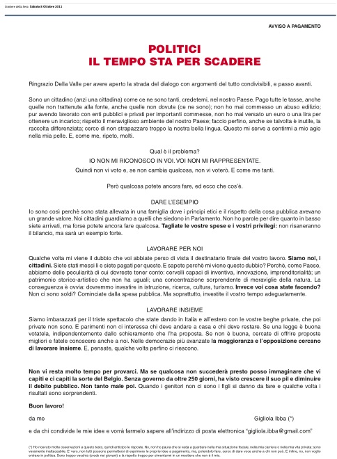 L’annuncio a pagamento contro i governanti nostrani va di moda. Dopo il “Politici, ora basta” che Diego Della Valle ha pubblicato una settimana fa su alcuni quotidiani, arriva un nuovo avvertimento: “Politici, il tempo sta per scadere”. Firmato Gigliola Ibba, “un cittadino (anzi una cittadina) come ce ne sono tanti nel nostro Paese”. Così si definisce chi ha comprato un’intera pagina sul Corriere della Sera di oggi per dire quello che pensa della classe al potere e richiamarla alle proprie responsabilità.