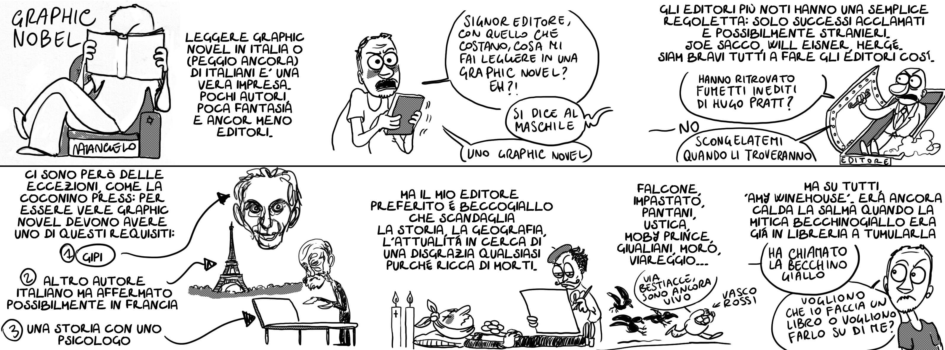 Per Saturno (l’inserto culturale del Fatto Quotidiano), anziché recensire a fumetti un romanzo grafico, ho pensato che fosse più divertente recensire gli editori. Chiaramente, ho ‘scoperto l’acqua calda’: il poco spazio dato ad autori esordienti, che accomuna il mondo delle nuvole a fumetti e quello dei libri ‘seri’. Ma fa sempre bene ribadirlo. E poi ci sono prese in giro a qualche editore che comunque apprezzo molto, ma non voglio scendere nei dettagli, lo specifico solo perché in rete, dopo aver letto la striscia sul quotidiano, qualcuno mi ha bollato come ‘uno che non ama questo genere’: niente di più sbagliato. Certo, ci sono delle cose inguardabili ma ce ne sono alcune superbe. E anche questa è la scoperta dell’acqua calda. Chiudo il discorso lasciandovi alla striscia e con un link a Sparidinchiostro, al quale è dedicata l’ultima vignetta della strip: a voi scoprire il perché.