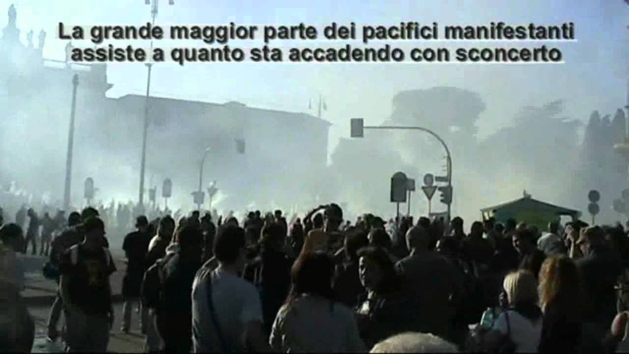 Ancora immagini dal centro di piazza San Giovanni: la colonna sonora è il rumore degli scontri della guerriglia.