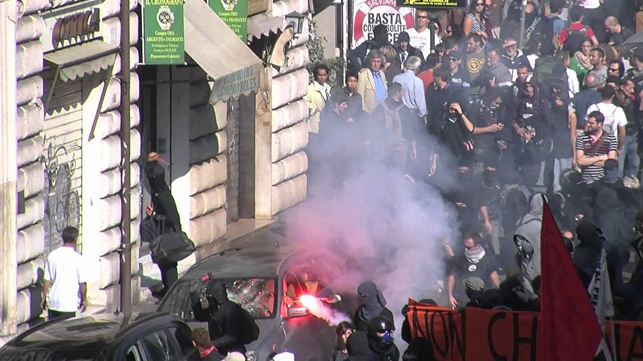 Al corteo degli indignados di Roma circa 200 autonomi vestiti di nero e con il volto coperto hanno spaccato vetrine in via Cavour all’altezza dei civici 120 e 143 e hanno preso di mira un’auto. Sulla strada e sui muri lasciano scritte come “Pianta grane e non tende” e “Tira le pietre non la cinghia”.