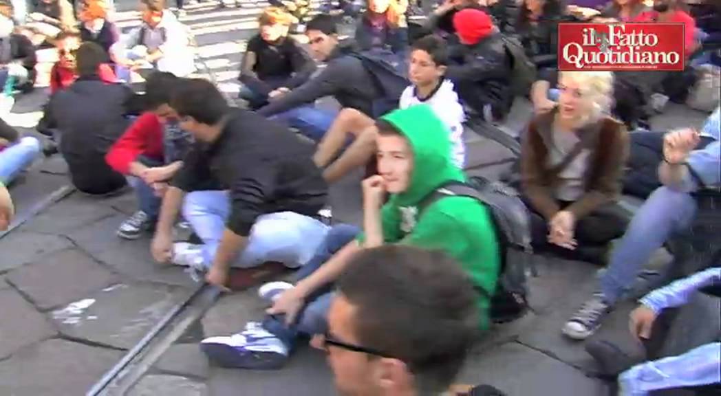 Davanti ai caschi schierati all’ingresso della Borsa cantano e ballano, mantenendosi a debita distanza dalle forze dell’ordine che si limitano a presidiare la piazza. Poi decidono di tornare verso il Duomo e prima sostano a gambe incrociate in Piazza Cordusio, dove ha sede UniCredit accompagnati da cori contro la crisi e rulli di tamburo.