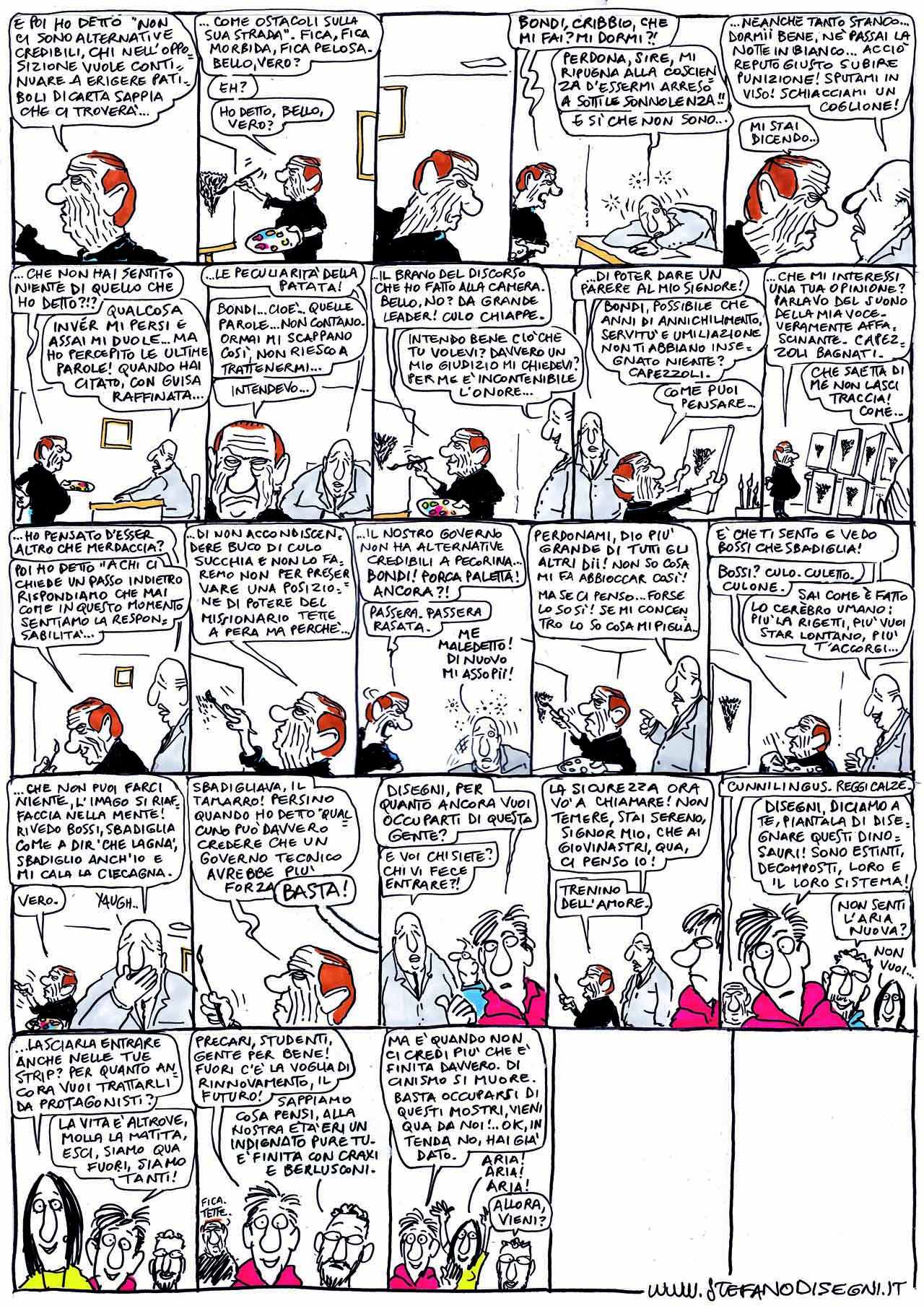 Il nostro Stefano Disegni è impegnato nell’ennesima strip: Berlusconi, la patonza che deve girare, la gnocca, il fido Bondi che ascolta le parole del leader, salvo addormentarsi al pensiero di Bossi che sbadiglia. Insomma, tutto come sempre, quando nuove voci irrompono nella sua vignetta e lo chiamano altrove, dove c’è vita nuova e aria, aria. Tanta aria nuova