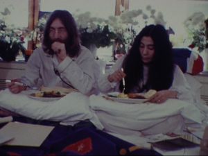 Di bianco vestiti l’1 giugno all’interno della stanza d’albergo i due registrarono Give peace a chance, il primo singolo della Plastic Ono Band. Il filmato ritrare lo stesso Lennon canticchiare il brano che diventerà inno del movimento pacifista di quegli anni, prima di essere inciso. Una straordinaria testimonianza visiva di una controcultura che fece storia e contribuì ad una nuova concezione linguistica della comunicazione. Eccezionalità che viene parificata alla norma per Archivio Aperto, dal 27 ottobre al 1 novembre all’Istituto Storico Parri, nell’ex Chiesa di San Mattia a Bologna.