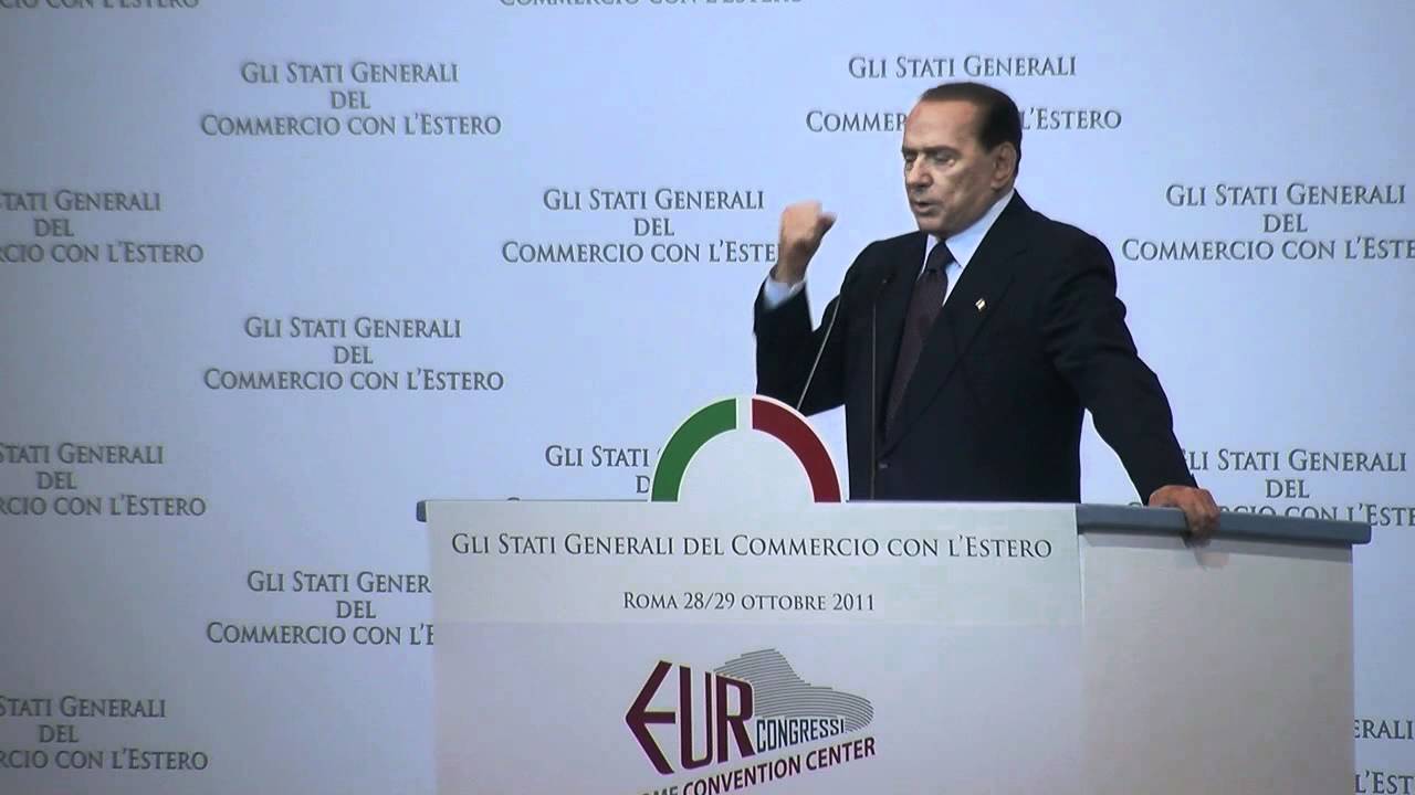 Agli Stati Generali del Commercio Estero, davanti una platea di imprenditori, Berlusconi parla di politica, di giustizia e sorvola la crisi economica. L’Italia rischia il default? Il premier incolpa l’Euro, la Costituzione che imbriglia il governo e gli alleati poco docili. Un imprenditore se ne va sconsolato: “Speravo parlasse di piccole e medie imprese, invece è stato solo un comizio”.