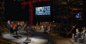 Ecco il “servizio pubblico” che, anche sul fronte della crisi, è stato carente: “Una domanda che ci dobbiamo porre è quanto ci è costato scoprire così tardi la verità. Se il nostro sistema fosse stato libero, saremmo arrivati prima alla verità. Avremmo potuto cambiare il governo o costringere il governo a seguire strade diverse”, ha affermato Santoro. Invece una trasmissione come Annozero, che questi temi li affrontava, è stata cancellata, e “la reazione del sistema è stata fiacchissima, anche dell’opposizione. Ora centomila persone hanno deciso di accendere le luci di questa sera”, tanti quanti hanno accettato di versare 10 euro per l’impresa di Servizio Pubblico. “Queste centomila persone si possono convincere che possono accendere tutto quello che vogliono. Possono accendere Celentano, Luttazzi, Dandini, la Rai che si sta spegnendo lentamente. Possono accendere un vero Servizio Pubblico”.