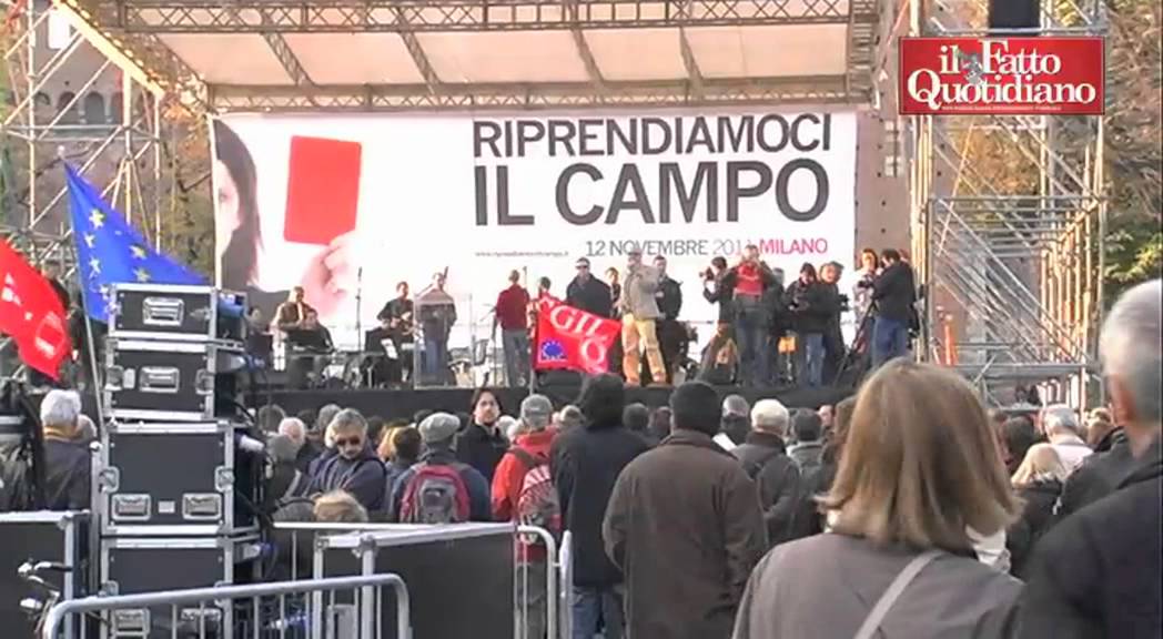 Migliaia in corteo a Milano il 12 novembre per l’iniziativa “Riprendiamoci il campo” promossa da sindacati, partiti, associazioni e personaggi della società civile. In piazza per una nuova politica economica che punti alla crescita, all’occupazione e ai diritti, sotto il simbolo di un allegorico cartellino rosso per espellere B. Il senso di responsabilità del Pd nella scelta di appoggiare un Governo di Mario Monti viene richiamato da Maurizio Martina, segretario regionale del Pd “perché non abbiamo certo paura del voto”. “È la fine di B. e di una politica cialtrona” dice Nando dalla Chiesa, che teme tuttavia “colpi di coda” finali di un B. “Discontinuità” – chiede Nino Baseotto, segretario regionale Cgil a un ormai probabile Governo Monti, “altrimenti saremmo pronti a scendere in piazza ancora”. “Ma attenzione” – ammonisce l’artista Moni Ovadia “a non essere fessi e pensare di aver vinto la battaglia. La rimozione dei danni che il Berlusconismo ha prodotto è una lunga strada da percorrere”.