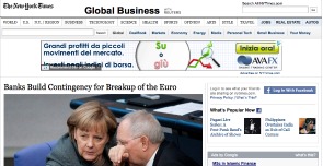“Banche come Merrill Lynch, Barclays Capital e Nomura – continua l’editoriale del New York Times – hanno diffuso una cascata di rapporti questa settimana che esaminano la possibilità di un crollo dell’eurozona”. “La crisi finanziaria dell’eurozona è entrata in una fase ben più pericolosa” hanno scritto venerdì gli analisti della Nomura. “A meno che la Banca Centrale Europea intervenga per aiutare dove i politici hanno fallito, un collasso dell’euro al momento sembra più probabile che possibile” ha detto la banca. “I principali istituti finanziari britannici, come Royal Bank of Scotland, stanno predisponendo piani di emergenza nel caso l’impensabile viri verso la realtà, hanno indicato i loro supervisori giovedì” riporta ancora l’editoriale di Nyt. “Le authority degli Stati Uniti stanno incalzando le banche americane come Citigroup ed altri istituti, a ridurre l’esposizione verso l’eurozona. In Asia, le autorità di Hong Kong hanno intensificato il monitoraggio dell’esposizione delle banche straniere e nazionali alla luce della crisi europea”.
