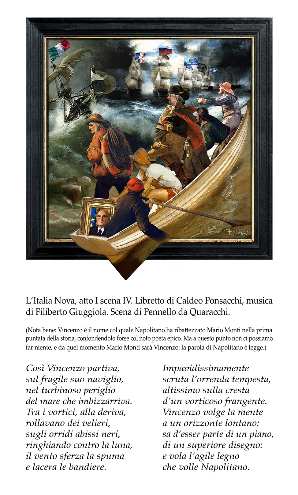 Napolitano e Monti nella tavola di Francesco SpadoniSeconda puntata. Che in realtà è un intermezzo, dato che la terza puntata ce la farà vedere Monti lunedì prossimo. Lì avremo da divertirci. Per ora, la barca sussulta tra orribili flutti.