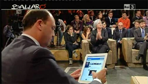 Angelino Alfano ne è convinto: “Cari amici, con l’uso del tablet a Ballarò e la comunicazione in diretta con voi, siamo stati i primi! Ce lo riconosce anche il Fatto Quotidiano, leggetelo: imperdibile!” ha scritto mercoledì su Facebook. Ospite il giorno prima alla trasmissione di Floris, durante un intervento di Rosy Bindi il segretario del Pdl ha sfoggiato un iPad bianco e si è mostrato a favore di camera mentre pistolava su Facebook.