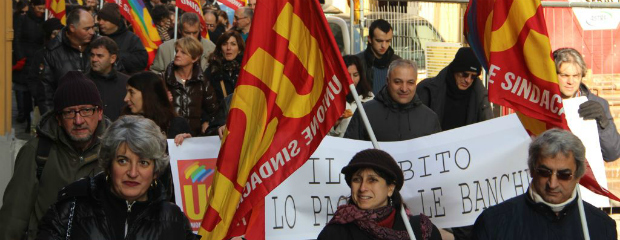 Ad aprire il corteo due striscioni “Via il governo Monti”, e “Il debito lo paghino le banche”. Al megafono la denuncia dei tagli alle pensioni e ai servizi, “mentre il governo garantisce gli speculatori e i ricchi”. E ancora: “Rivalutano i valori catastali di tutte le case, ma fanno lo sconto alla banche e alla Chiesa”.