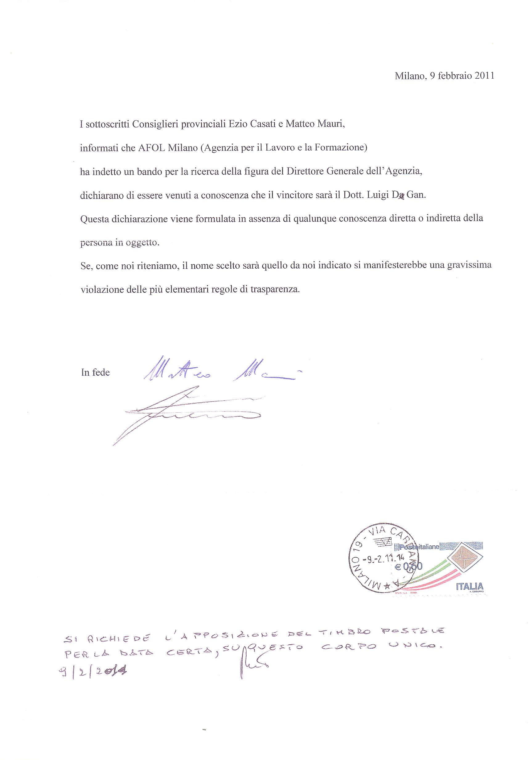 Il concorso è viziato da irregolarità evidenti ed è da rifare. Il Tar lombardo accoglie il ricorso di un candidato escluso dalla gara indetta dalla Provincia di Milano per individuare il nuovo direttore generale dell’agenzia per il lavoro Afol. Concorso subito contestato per il sospetto che fosse stato costruito “su misura” di Luigi Degan, uomo vicino al presidente della giunta provinciale Guido Podestà. All’apertura della busta con il nome del vincitore sono scattati il ricorso di uno dei 24 esclusi e un esposto da parte dell’opposizione di centro sinistra. Di più. Proprio per dimostrare che il vincitore era stato deciso a tavolino prima della prova, un mese prima dell’apertura delle buste i consiglieri del Pd Matteo Mauri ed Ezio Casati avevano depositato il 9 febbraio presso un notaio una scrittura contenente il nome del “prescelto” (leggi il documento).