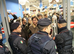 “Non vogliamo regali, ma solo riprenderci i nostri diritti” e “Mario Monti pagaci la spesa” erano gli slogan recitati da una piccola folla di giovani, circa un centinaio tra studenti e precari, che si sono dispersi tra gli scaffali colmi di beni in vista delle feste natalizie. Ma il direttore del punto vendita ha chiamato la polizia, e le forze dell’ordine hanno bloccato e identificato manifestanti e giornalisti.