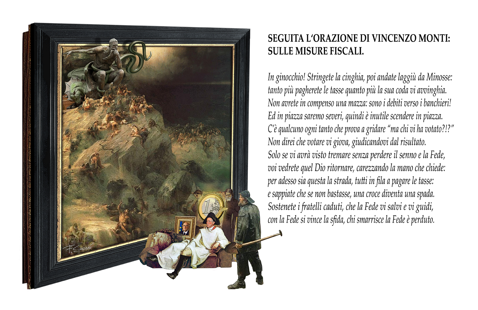 Vincenzo Monti ha appena terminato l’allocuzione della precedente scena che se ne apre un’altra: i naufraghi, vegliati da un Minosse pericolosissimo e senza pietà, hanno una scelta, a parte quella di ritornare nel mare limaccioso: pagare le tasse.