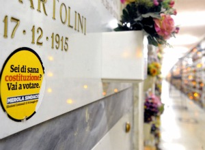 Adesivi elettorali sulle lapidi della Certosa. Ma nessuno in 7 mesi se n’è accorto