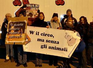 Mai più animali costretti ad esibirsi nei circhi, a subire addestramenti con scariche elettriche, vite itineranti al freddo, in gabbia e in catene, al seguito del carrozzone circense di turno. Questo il messaggio che le associazioni Animalisti Italiani, Lav – Lega Antivivisezione e Salviamo gli orsi della Luna di Bologna hanno lanciato nel weekend di Capodanno con l’esibizione di cartelli e slogan di fronte all’Unipol Arena di Casalecchio di Reno, sede dello spettacolo del Circo di Mosca – David Orfei.