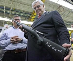 Newt Gingrich tiene in mano un fucile che ha firmato per Tom Sullivan, a sinistra, vicepresidente di stabilimento presso Sturm, Ruger & Co., azienda produttrice delle armi da fuoco Ruger (Newport, New Hampshire, 6 gennaio 2012). Per ingrandire clicca qui