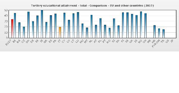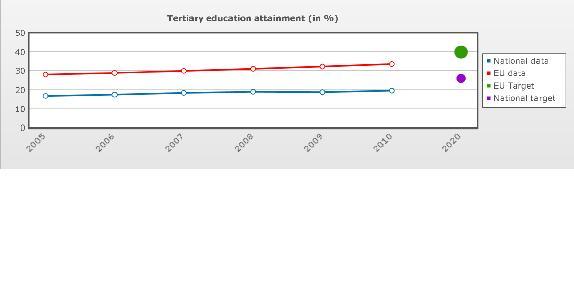 Per l’Italia c’è molto da fare, siamo parecchio indietro rispetto ad altri Stati Membri. Consiglio ai lettori una visita del sito sul monitoraggio della Strategia Europa 2020. Ne prendo un esempio significativo, il tasso di educazione superiore (percentuale dei 30-34enni che hanno completato l’università o studi equivalenti, un parametro fondamentale per il futuro di una nazione). Il pallino verde del grafico è l’obiettivo complessivo dell’Ue. Quello viola è l’obiettivo dell’Italia, parecchio più basso…