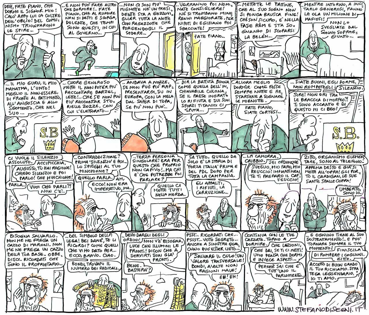 Niente sembra turbare il sonno del padrone. Dopo le fatiche del governo e dei processi, Silvio Berlusconi si gode il meritato riposo. Finché il prode Bondi non sfida la sua collera per informarlo di un grave pericolo che incombe su quello che fu il suo regno: un manipolo di deputati vuole incarcerare Cosentino. Non sia mai, il Cavaliere torna in sella, e con un’idea geniale risolve la situazione…