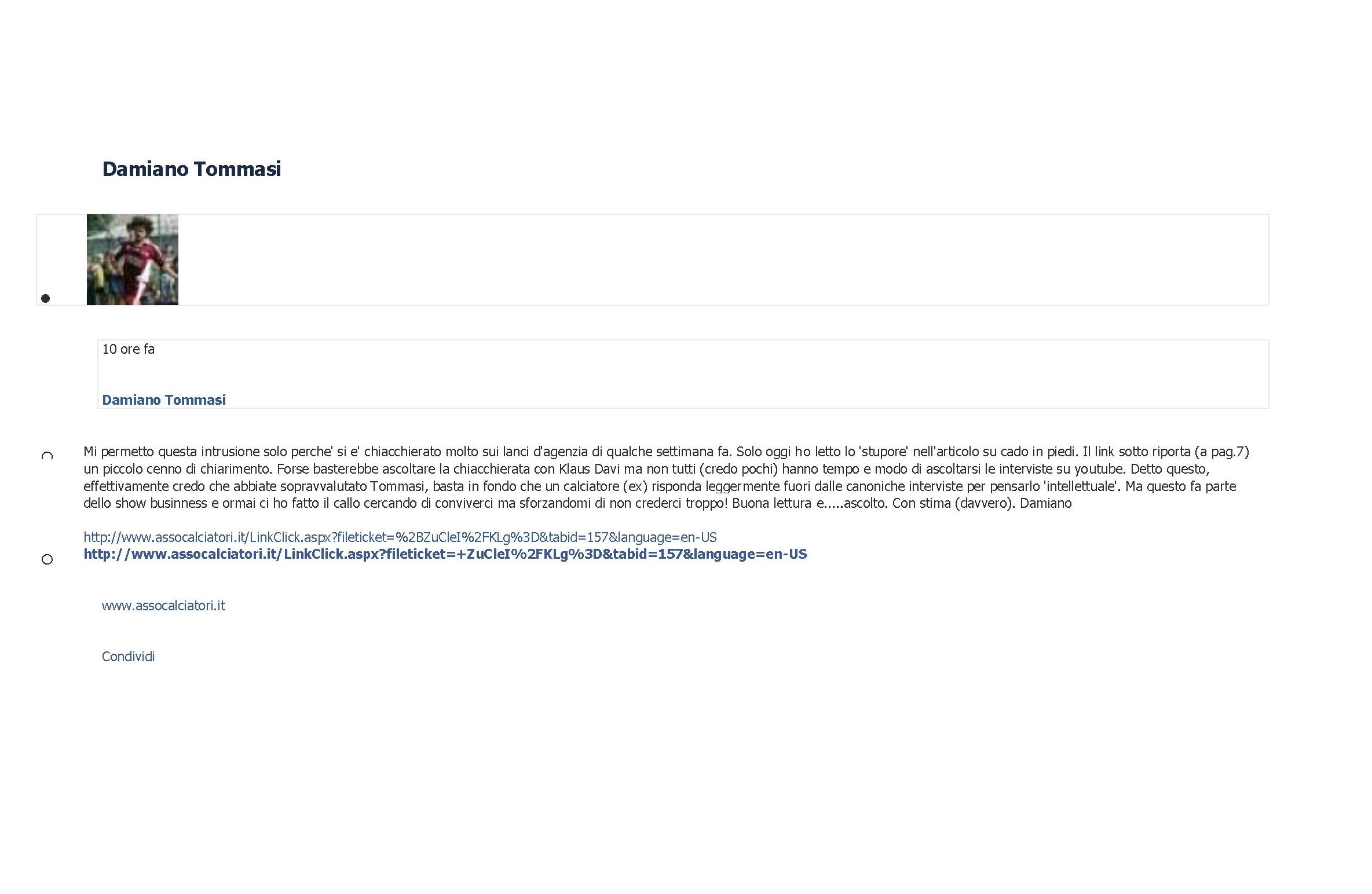 “Mi permetto questa intrusione solo perché si è chiacchierato molto sui lanci d’agenzia di qualche settimana fa. Solo oggi ho letto lo ‘stupore’ nell’articolo su cadoinpiedi. Questo link riporta (a pag.7) un piccolo cenno di chiarimento. Forse basterebbe ascoltare la chiacchierata con Klaus Davi ma non tutti (credo pochi) hanno tempo e modo di ascoltarsi le interviste su youtube. Detto questo, effettivamente credo che abbiate sopravvalutato Tommasi, basta in fondo che un calciatore (ex) risponda leggermente fuori dalle canoniche interviste per pensarlo ‘intellettuale‘. Ma questo fa parte dello show businness e ormai ci ho fatto il callo cercando di conviverci ma sforzandomi di non crederci troppo! Buona lettura e…..ascolto. Con stima (davvero). Damiano
