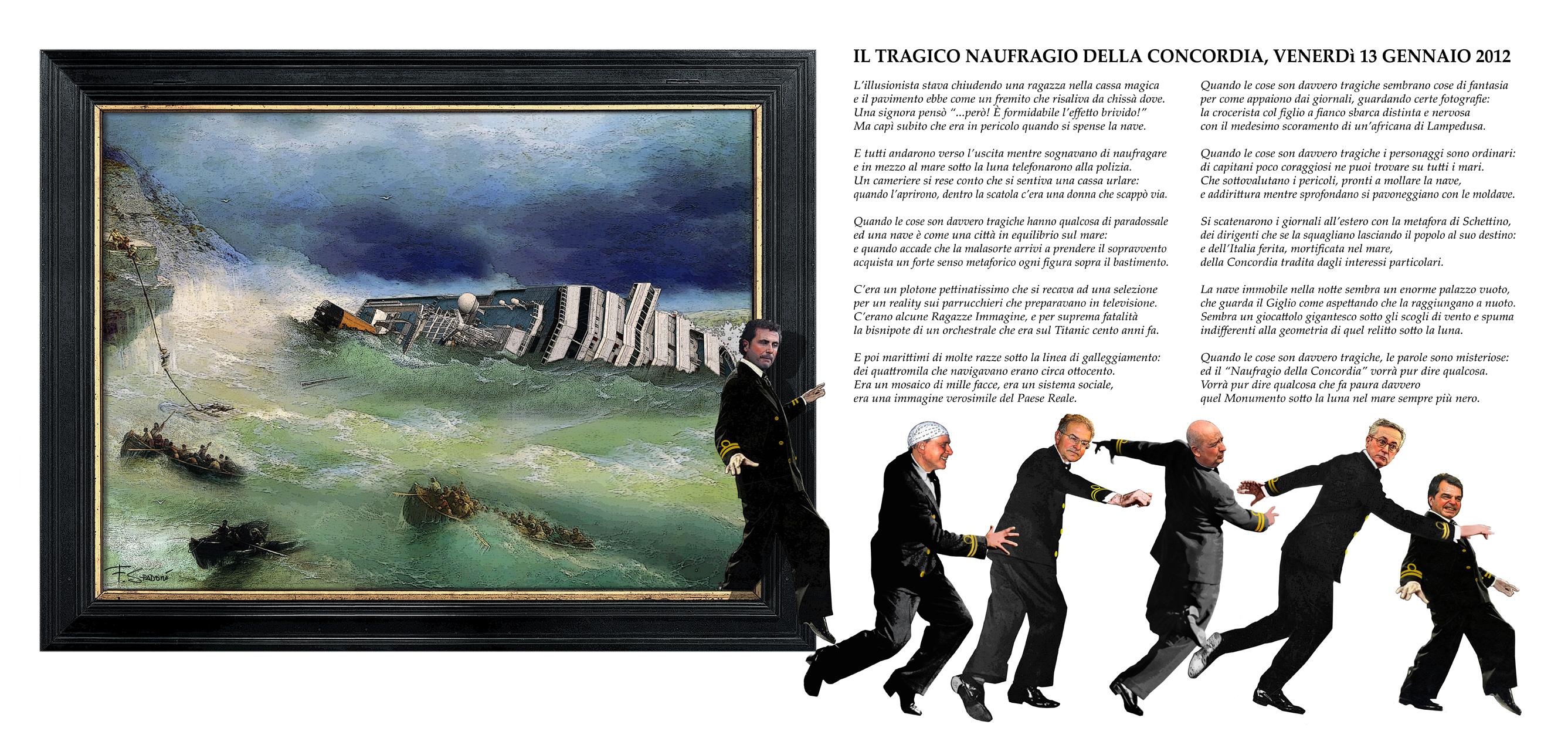 Il naufragio della Concordia visto da Francesco SpadoniIl tredici gennaio, venerdì, assistiamo quasi in diretta al naufragio della Concordia. Le vittime sono numerose, e ancora stanno cercando di recuperarne i corpi. L’evento, date certe caratteristiche del comandante e della manovra, diventa immediatamente emblematico: è una tragedia come l’affondamento mette in evidenza comportamenti, coraggio, vigliaccherie: insomma parole antiche.