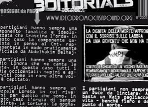 L’episodio contestato risale a novembre, quando la sezione parmigiana della “tartaruga” inventata da Gianluca Iannone diffuse tra gli studenti il giornale dell’associazione contenente la foto di un partigiano e la didascalia che liquidava la Resistenza come “raffiche di mitra, violenze e stupri“. Accanto all’immagine compariva un editoriale – ripreso dal sito nazionale del movimento – che partendo dall’uccisione di Gheddafi finiva per abbozzare un parallelismo con la Lotta di liberazione del ‘43-’45 in Italia: “Non basta un Rais a fare un Duce – vi si leggeva – ma basta un’ora di viltà (…) per fare un partigiano” . E ancora, più per esteso, Casapound Parma scriveva sotto alla foto del partigiano: “Contro il ghigno di un vecchio bastardo bombardamenti indiscriminati, raffiche di mitra, violenze e stupri, altro che Resistenza”.