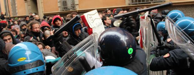 Dentro l’università di Bologna, il presidente della Repubblica Giorgio Napolitano riceve la laurea ad honorem, fuori dall’Ateneo, come annunciato, le proteste. Gruppi di studenti, partiti in mattinata da piazza Verdi, hanno tentato di forzare il cordone di sicurezza allestito in via de Poeti nel centro città per provare ad avvicinarsi all’aula Magna di Santa Lucia dove era in corso la cerimonia. La polizia ha risposto con alcune cariche di alleggerimento. Sono volate anche uova, frutta e ortaggi. Due manifestanti sono stati feriti, ma stanno proseguendo il corteo con il ghiaccio sulla testa e il cronista di Repubblica, Alessandro Cori, è stato colpito da alcune manganellate. Secondo i membri di Occupy Bologna “Napolitano non è la faccia pulita che tutti descrivono. Altro che Re Giorgio! Lui è il primo responsabile di un futuro segnato dalla precarietà”.