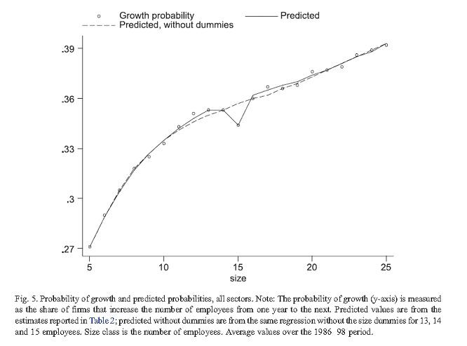 Abbiamo anche considerato la propensione a crescere delle imprese. Se passare la soglia dei 15 dipendenti è molto costoso in quanto si diventa soggetti all’articolo 18, ci dovremmo aspettare che le imprese siano molto restie a farlo. La figura sotto riporta la quota di imprese che accrescono l’occupazione da un anno all’altro. La quota cresce regolarmente con la dimensione, in quanto più grande è l’impresa e maggiore è la probabilità di accrescere l’occupazione (e, simmetricamente, di decrescerla). Si vede molto chiaramente un calo in prossimità della soglia: le imprese sono più restie a crescere quando ciò comporta il passaggio di soglia. Ma la caduta è modesta: la probabilità di crescere scende dal 35% che si verificherebbe senza l’effetto soglia al 33 per cento (abbiamo riscontrato riduzioni di entità simile in corrispondenza delle soglie che fanno scattare l’obbligo di assunzione di categorie protette, una tutela che certo non riceve l’attenzione dell’articolo 18) (2). Utilizzando tecniche statistiche, abbiamo anche calcolato che la dimensione media delle imprese italiane crescerebbe dello0,5 per cento rimuovendo l’effetto soglia. Siamo ben lontani dal raddoppio necessario per arrivare ai livelli degli altri paesi industrializzati.