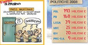 Nemmeno lo spread li ha fermati. Lo raccontano Elio Veltri e Francesco Paola nel libro I soldi dei partiti. Al Senato, infatti, a metà luglio c’era la possibilità di eliminare una delle norme assurde, aggiunta nel 2006, che impone di pagare per intero i fondi elettorali anche per le legislature interrotte. Ultimo esempio, quella dal 2006 al 2008. I partiti (compresi quelli che non hanno rappresentanza parlamentare: l’importante è superare l’un per cento, altra norma folle) riceveranno i rimborsi calcolati per cinque anni e non per gli effettivi due. Non solo. Il rimborso è doppio perché poi c’è la legislatura successiva, che va dal 2008 in poi.Una cuccagna. Bene. Quest’estate, a Palazzo Madama, l’abolizione della norma era nel pacchetto anti-crisi per la stabilizzazione finanziaria ma è stata rinviata. Ovviamente.