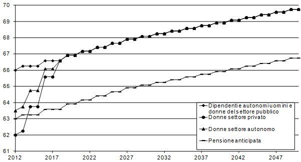 Il fenomeno più evidente che si coglie è il continuo innalzamento dell’intervallo all’interno del quale sarà possibile accedere al pensionamento. Eccezion fatta per i lavori usuranti, nel 2050 non si potrà andare in pensione prima di aver compiuto 66 anni e 7 mesi e l’età del pensionamento di vecchiaia sarà fissata a 69 anni e 9 mesi.