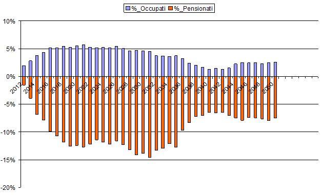Variazione percentuale di occupati e pensionati a seguito degli effetti della riforma delle pensioni. 2012–2050