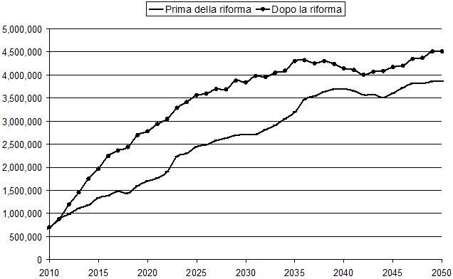 La figura 2 mostra gli effetti della riforma pensionistica sullo stock di occupati e pensionati in una simulazione che comprende le modifiche apportate alla normativa pensionistica nel dicembre 2011, assumendo per il futuro uno scenario di partecipazione e occupazione coerente con quello osservato nel passato recente.