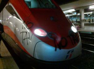 Verso le 19 il grosso dei manifestanti, ormai ridotto a poco meno di 200, ha lasciato la stazione dirigendosi verso Piazza Maggiore. Una quarantina di giovani, alcuni dei quali appartenenti all’Aula C, ha invece deciso di fermarsi ancora e continuare il blocco, questa volta al binario 6. Il Frecciarossa 9550 Salerno-Milano è stato così bloccato per quasi mezz’ora. Alla fine la ripartenza, ma con due scritte “No Tav” tracciate a vernice sul locomotore.