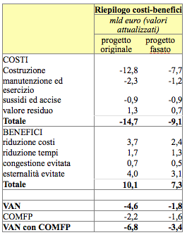 Anche se il rapporto fra benefici e costi resta deficitario, ne consegue comunque un beneficio netto per la collettività di (4,6 – 1,8) = 2,8 miliardi. Se poi ci si aggiungesse il costo-opportunità dei fondi pubblici, (“Compf” nella tabella), data l’assoluta irrilevanza dei ricavi netti del progetto, il beneficio per la collettività del passaggio alla versione “low-cost” aumenterebbe ancora, ma anche qui non ci dilunghiamo.