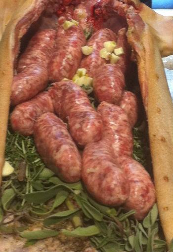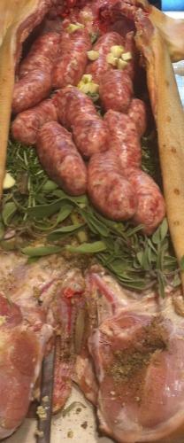 Poi, come vedete dalla foto, non ho resistito. Sì è vero, sono toscano. Prima di cuocerlo in un forno a pane fatto calare fino a 130 gradi per sette ore, li ho farciti entrambi di salsicce freschissime e grassissime di Colle Val d’Elsa, aglio, salvia, rosmarino, un po’ di pepe e la scorza (altro regalo di un conoscente) di un cedro del Vesuvio. Solo allo scadere delle sette ore ho riacceso il fuoco per crocchiare, aiutato da uno spiedo, tutta la loro pelle. Ogni ora aggiungevo un mezzo litro di acqua che, amalgamandosi con la cottura dei grassi, si trasformava lentamente in una sugagna brunita che ho poi riaggiunto in un’enorme teglia di patate arrosto. Quest’ultime l’hanno assorbita tutta, diventando così la cosa più buona del mondo, ovviamente dopo il “maialino sardo”. Ah sì, li ho salati, come mi era stato detto, solo alla fine dopo averli tranciati. Poi li ho condivisi e mangiati.