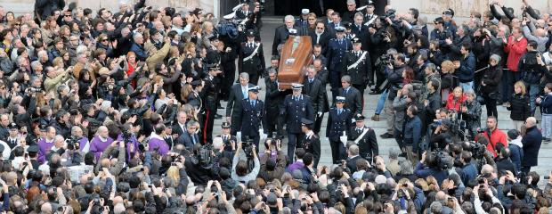 Il feretro è entrato nella Basilica di San Petronio attorno alle 14.15. Sono bastati pochi passi da quella camera ardente allestita nel cortile d’onore del Comune di Bologna e visitata da amici, parenti, colleghi e semplici fan di Dalla per entrare nella chiesa simbolo della città. Fuori il silenzioso abbraccio di settantamila persone davanti ai maxischermi. All’interno tutti quelli che nelle ultime 48 ore avevano salutato il feretro: Luca Carboni, Renzo Arbore, Ligabue, Gaetano Curreri, Jovanotti, Renato Zero, Ron, Gianni Morandi, Roberto Vecchioni, Pierdavide Carone.
