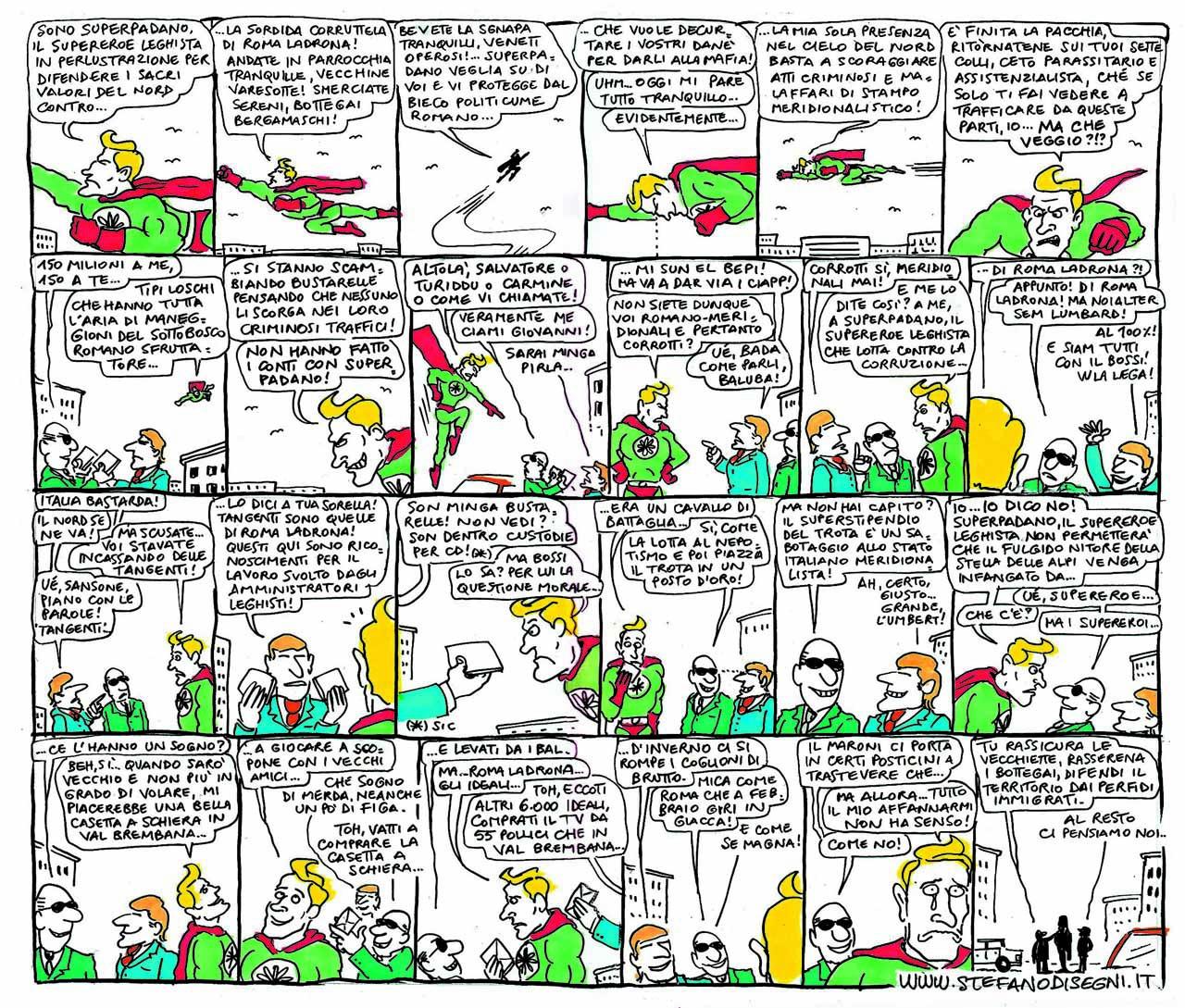 Contro la corruzione, il malaffare, le tangenti e il malcostume della politica romana c’è un solo rimedio: il superpadano. Il nostro supereroe vigila senza sosta e senza paura su ogni scambio sospetto. Rassicura i padani e li tiene lontani dal crimine. Che può continuare indisturbato, a fare i suoi affari poco più in là.