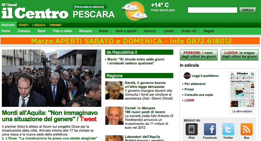 Insomma, leggendo fra le righe – con buona pace di Monti che elogia Letta – vi si trova il più grande fallimento del Governo Berlusconi, raccontato agli italiani come il suo più grande successo. D’altro canto, lo stesso Monti ha ammesso: «Non immaginavo una situazione del genere» (era il titolo di ieri del giornale locale il Centro, come si può vedere dall’immagine. Oggi è stato già sostituito dal più rassicurante «La città ripartirà come l’Italia»).