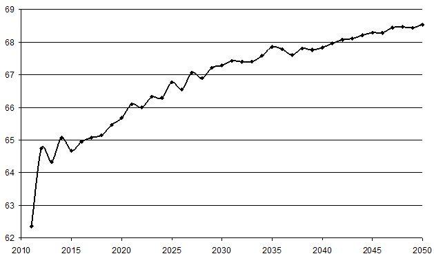 Per dare una risposta alla domanda dobbiamo guardare ai cambiamenti attesi nell’età di pensionamento. La figura 2 descrive l’andamento dell’età media di pensionamento per il periodo 2012-2050. È immediato notare che le nostre simulazioni indicano, nel corso dei prossimi quaranta anni, un aumento dell’età media di pensionamento di circa sette anni, dai 61,5 anni del 2011 ai 68,5 anni del 2050, superiore anche all’incremento atteso, nel medesimo periodo, nell’aspettativa di vita.
