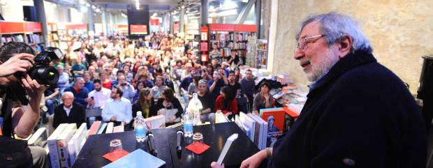 Il cantautore presenta davanti ad almeno mille persone il suo "Dizionario delle cose perdute" alla libreria Ambasciatori di Bologna. Poi due battute sullo stato del governo: "Non c'è nessuno che mi piaccia, qualcosa hanno fatto, forse. Ma è un momentaccio"