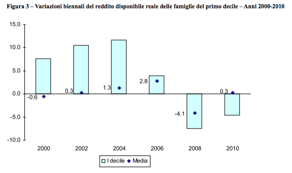 Così, mentre tra il 2000 e il 2004 la crescita può qualificarsi pro poor (variazioni superiori alla media per i decili inferiori) e nel 2006 sostanzialmente neutra, nel 2008 e 2010 l’andamento è risultato decisamente svantaggioso per le famiglie a più basso reddito.