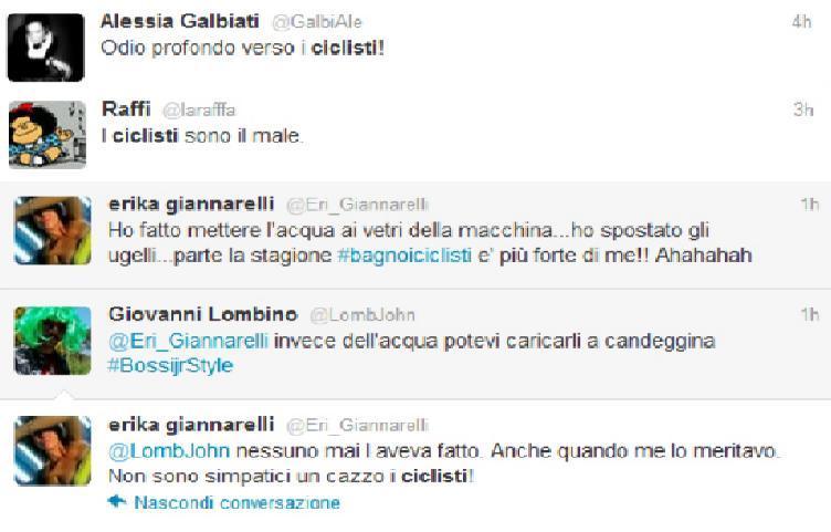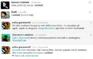 Cercando la parola “ciclisti”, si può andare a sbirciare cosa pensano i twittari di chi va in bicicletta e i tweet di odio sono tutti lì, pronti ad essere letti (vedi immagine).