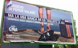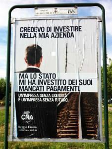 Da qualche settimana la Cna di Reggio Emilia ha diffuso una campagna affissioni che allude ai numerosi suicidi di imprenditori avvenuti in Italia negli ultimi mesi, e li accompagna con queste parole: