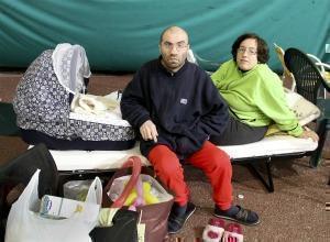 “Io ho una bimba di un mese e alla mia famiglia hanno dato solo una branda in questo capannone, che gocciola, è freddo e non posso nemmeno cambiare la tutina a mia figlia per timore che si ammali – racconta Mauro Baruffaldi, seduto in un angolo con la moglie Lorenza e figlia Amelia – sono stato operato di tumore al cervello e dovrei stare calmo, riposare, ma come si fa a stare tranquilli in questo posto, pieno di gente, di confusione? Ci avevano detto che stavano allestendo altri accampamenti nelle palestre delle scuole ma stanotte, una volontaria della protezione civile che ha dormito accanto a noi ci ha risposto che non era vero. Cosa dobbiamo pensare? Che organizzazione è questa? Siamo sfiduciati”.