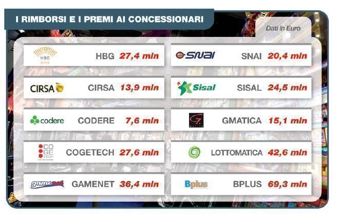 Entrambi i tesoretti dovranno essere divisi tra i concessionari pro quota: alla BPlus di Francesco Corallo andrà il 24,3 per cento delle somme; a Lottomatica il 15 per cento; alla Hbg il 9,6 per cento; alla Gamenet il 12,8 per cento; alla Cogetech il 9,6 per cento; alla Snai il 7,1 per cento. Alla Gmatica il 5,3 per cento; a Codere il 2,6 per cento.