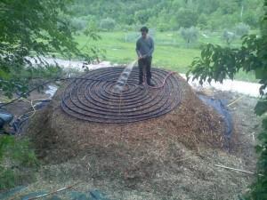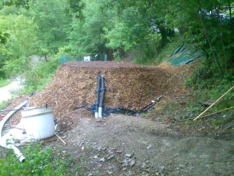 Si costruisce un cumulo di scarti agricoli e legna verde triturati. 70 cm di materia organica, poi uno strato di tubi messi a spirale, altri 70 cm di triturato (tecnicamente detto cippato), altra spirale di tubi. 3 strati di tubi, una roba alta 2,8 metri, sotto un telo che porta i liquidi che scolano in una piccolo accumulo dal quale vengono ripompati in cima al cumulo (sono tutti grassi batteri fecondi peggio dello yogurt) una copertura sul cumulo per evitare le piogge dilavanti. Inizialmente si innaffia per 3 giorni in modo che si imbibisca bene. Poi dovrebbe andare avanti a fermentare e quindi produrre calore (i batteri scaldano) per 18 mesi. E non puzza!