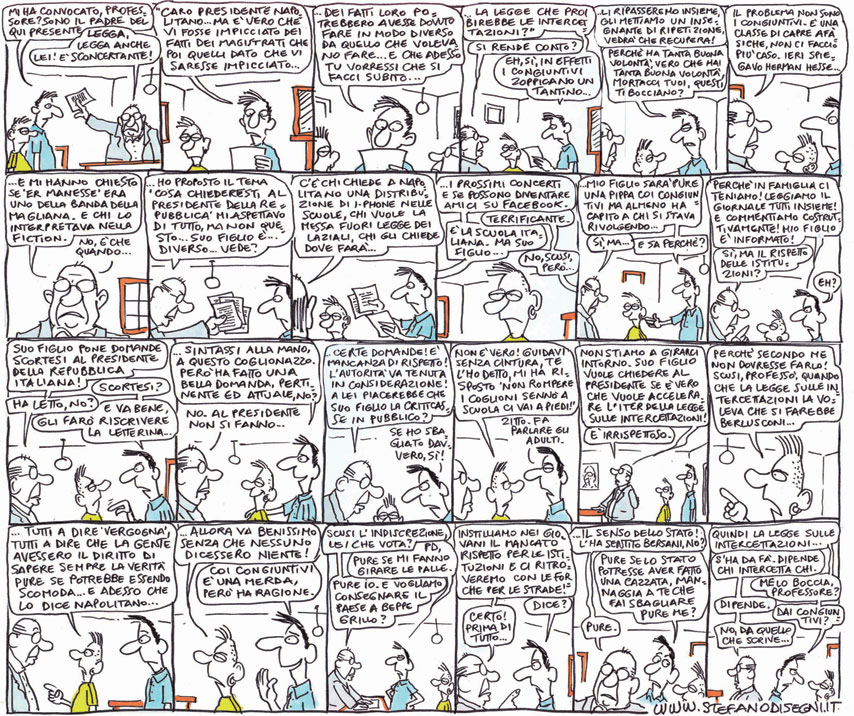 Un genitore va a colloquio con il professore. E scopre che il problema del figlio non sono i congiuntivi, ma le domande scomode rivolte a Giorgio Napolitano in un tema: “E’ vero, presidente, che vuole accelerare l’iter della legge sulle intercettazioni?”