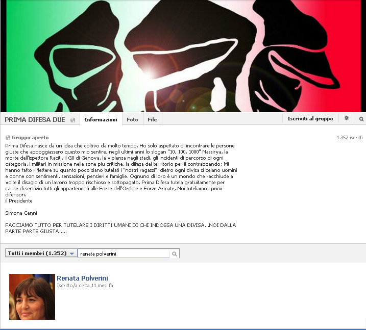 P.S. Al momento, al gruppo “Prima Difesa Due” risulta iscritto, da 11 mesi, anche il profilo facebook di Renata Polverini.