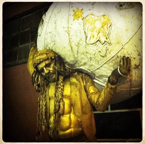 Quando due ore più tardi attracco al porto di Los Cristianos, a Tenerife, capisco quanto la macchina del vacanzificio sia potente e ben oliata: la playa di Las Americas corrisponde esattamente a quei sogni (incubi?) di vacanza, a quell’immagine delle Canarie. Ma le mie sono solo opinioni discutibili, quello che patisco è l’arroganza della comunicazione a senso unico, come se non esistesse nient’altro all’infuori di quello. Poi mi trovo a camminare per le stradine di Puerto de la Cruz, città storica e balneare situata nella parte nord occidentale dell’isola. In questo inizio estate, tutti i giorni verso le 19, un artista dal nome Konstantinos Spyriadis si dipinge d’oro, barba inclusa, sale su un piedestallo sistemato in una viuzza del centro e sorregge per ore, immobile, un enorme globo, mettendo in scena la mitica punizione che Zeus inflisse ad Atlante: sostenere da solo il peso dell’intero Universo.
