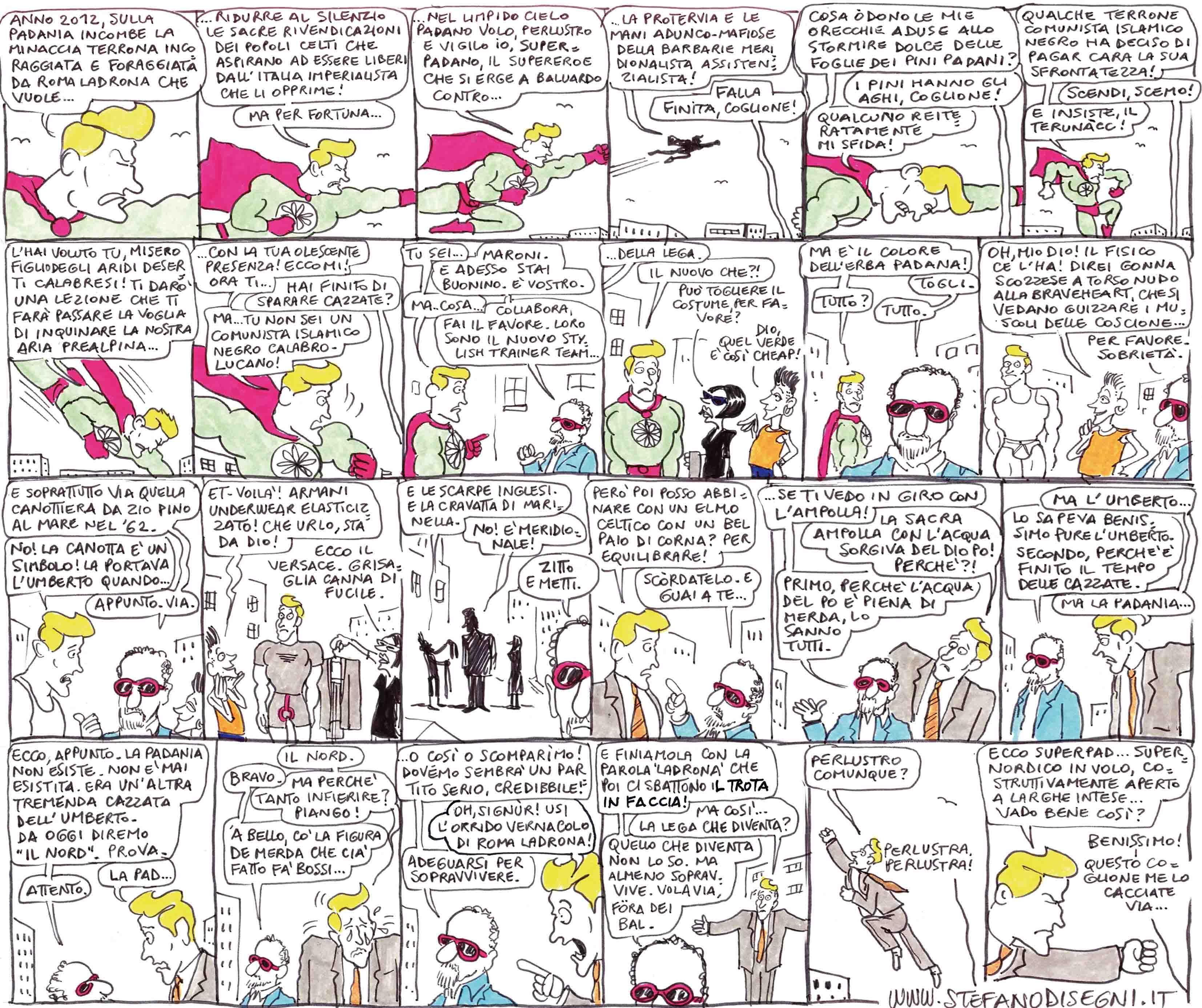 Tocca a Roberto Maroni, il nuovo segretario della Lega Nord, ripulire l’immagine del partito, appanata da scandali, chiacchiere ed eventi funesti. Il suo sguardo vigile e deciso si posa su tutto, non tralascia neanche un dettaglio nel lungo cammino verso la risalita al potere. Così, tocca anche al supereroe verde adeguarsi al cambiamento in atto: Superpadano adesso veste Armani.